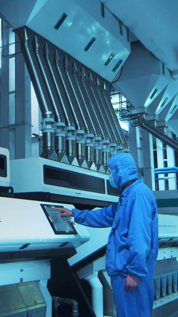 在生產加工環節,采用國際先進生產線,每粒米都需歷經碾、刷、拋、選全流程加工,輕磨輕拋,適度加工,最大保留米中營養;國際先進雙紅外色選機,通過粒型、水分、色值等全方位篩選,保證大米品質;整個大米加工0接觸、0環節,全部采用智能化管理,健康安心。